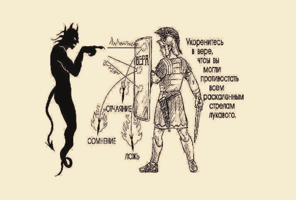 Когда человек работает над собой, он вырабатывает в себе силы, состояния, сквозь которые не могут пробиться эти огненные стрелы, разрушающие силы. Такие душевные состояния действительно как бронь, доспехи, с помощью которых человек защищает своё душевное пространство. Эта «духовная брань», бодрствование есть борьба с самим собой, с теми состояниями, которые возгораются в человеке от стрел, посылаемых супостатом. Сквозь щит Веры, то есть через ту силу, которая возникает в душе, когда человек во всём полагается на волю Божью, эти стрелы не могут пробиться.