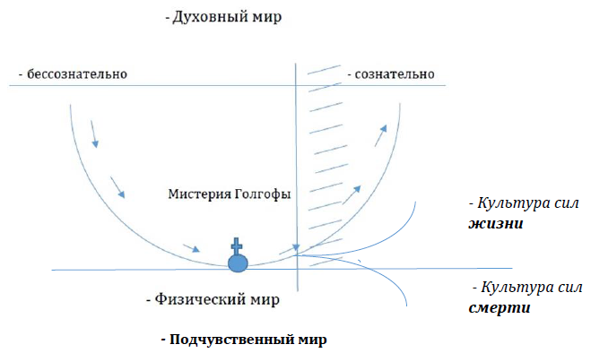 Правомерное развитие заключается в том, чтобы люди совершали это восхождение в Духовный мир сознательно, и получая оттуда импульсы, создавали одухотворённую культуру, а противоборствующие силы хотят, чтобы это происходило бессознательно, чтобы человек своим сознанием оставался только на физическом плане, либо встал на путь снисхождения в подчувственный мир. Это объективный процесс.
