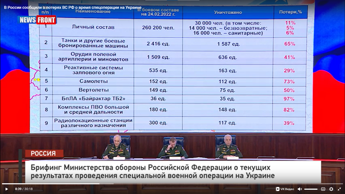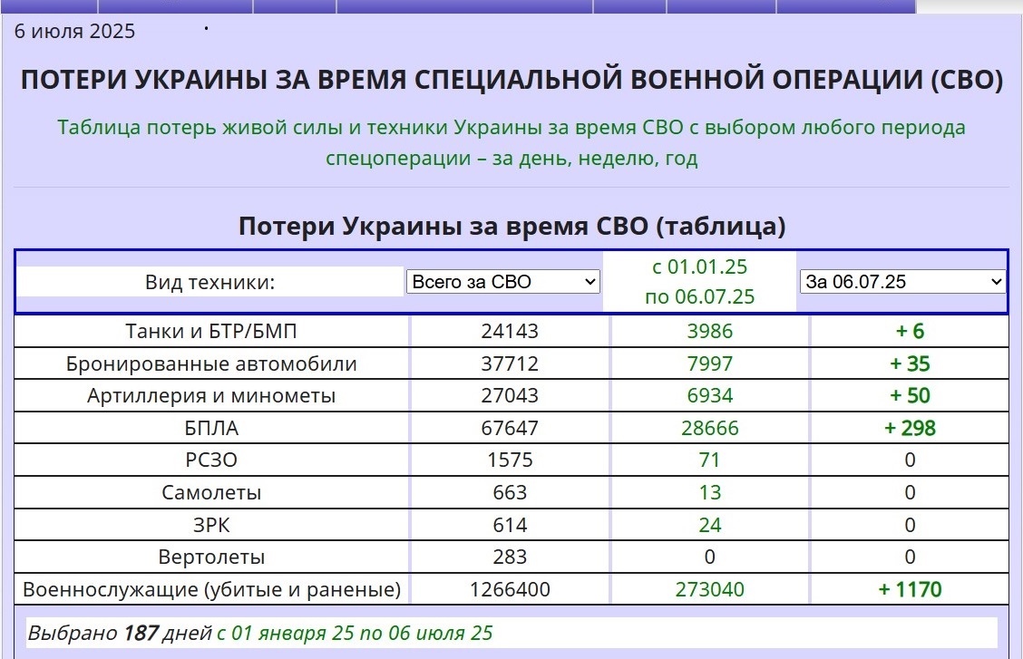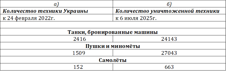 3. б) Таблица: Потери Украины за время специальной военной операции. Данные, озвученные Министерством обороны РФ от 6 июля 2025г. https://vkvideo.ru/video-70204174_456277248?ref_domain=yastatic.net